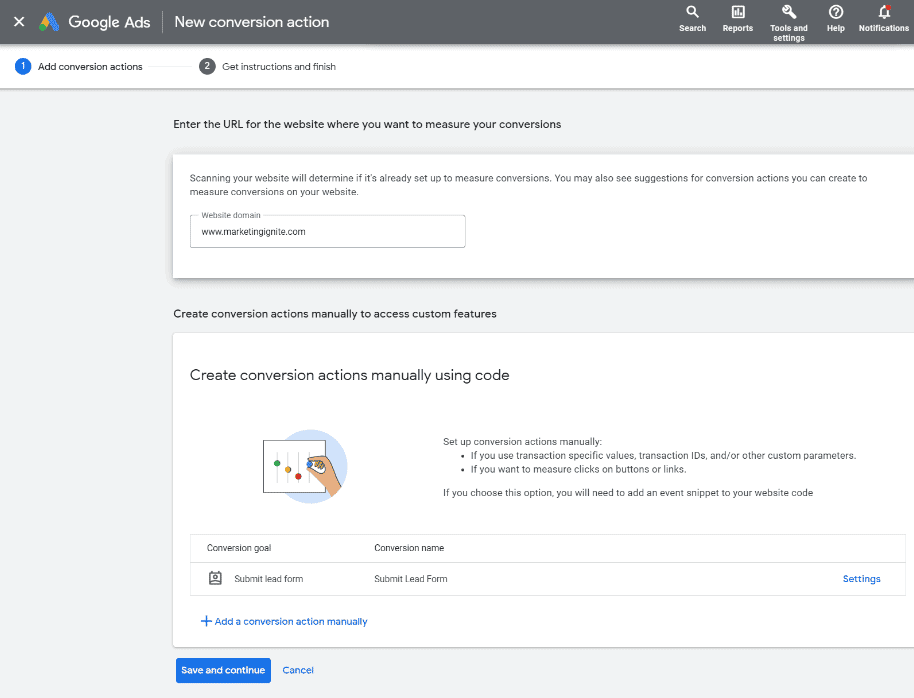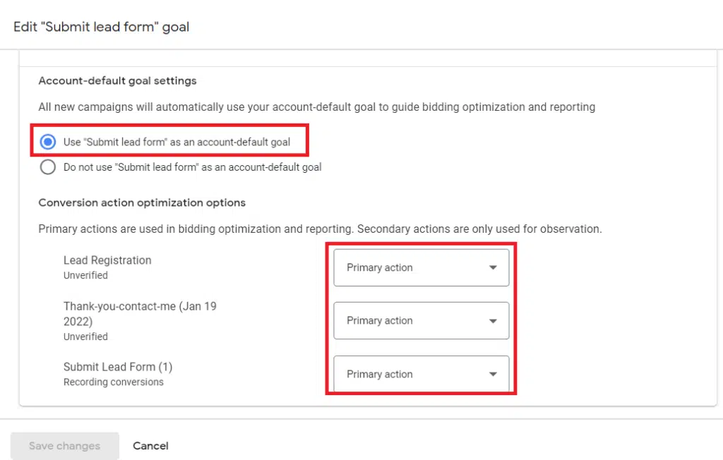 a) For the ‘Goals and action optimization”, enter in the goal category. For example, if you have a lead generation-based website you should select the “Submit Lead Form” option in the drop-down menu.