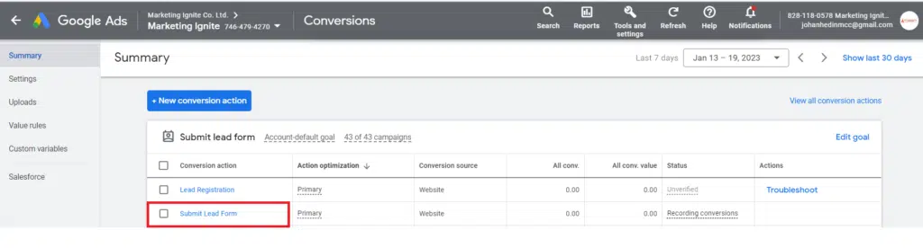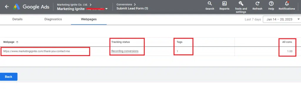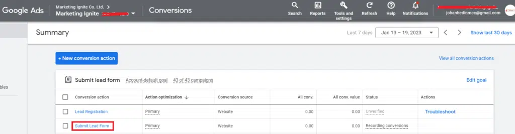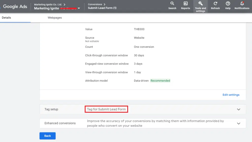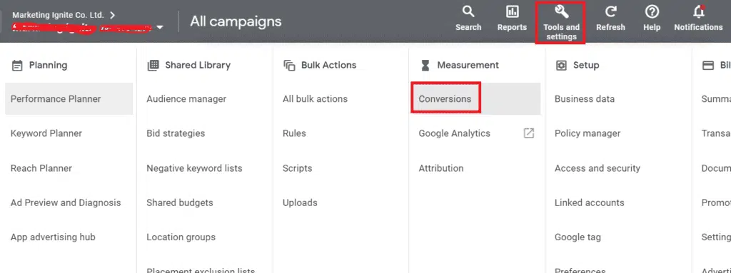 If the conversion tracking is not working properly, you need to check if the Google Ads “Conversion ID” and the “Conversion Label” in Google Ads are matching the same values as Google Tag Manager. To check if they are matching correctly, click on “tools and settings” in your Google Ad Account. Then click on “Conversions”.