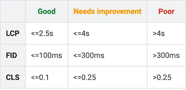 Core Web Vitals: Satisfactory scores in LCP, FID, and CS, which examine the visual loading, interactivity, and visual stability of a page, respectively.