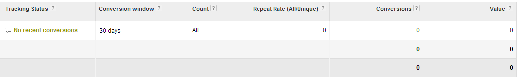 This screenshot shows there were zero conversions in the past 30 days. This is hard to believe even in the most horrible ads. A total beginner may misinterpret this as a problem with the ad copy or some other elements of the campaign, but this is likely a case of improper installation of conversion tracking.