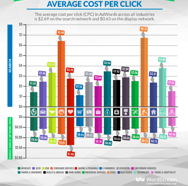Here’s another example. Let’s say you’re in the travel industry, and your average cost per click (CPC) is $3. Most beginners would celebrate and consider this quite low, but, as shown in this infographic by WordStream, you’ll see that the average CPC in the travel industry is $1.53, and you’re actually paying too much: