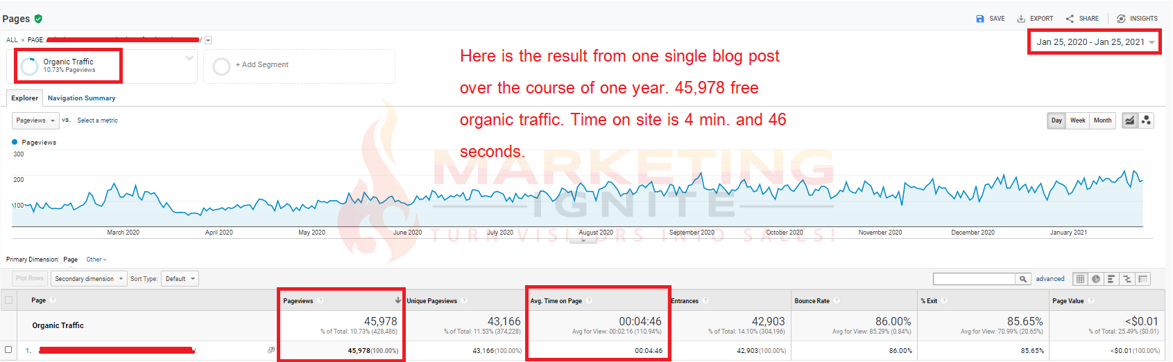 Here is an example of the results from one single blog post. This is FREE targeted traffic from Google that we have delivered for this client. With a solid SEO strategy for your blog, one single post can sometimes rank in the top for a number of related phrases. This is the reason why we are able to generate lots of organic traffic for our clients. How much would your business be impacted by thousands of targeted visitors to your website?