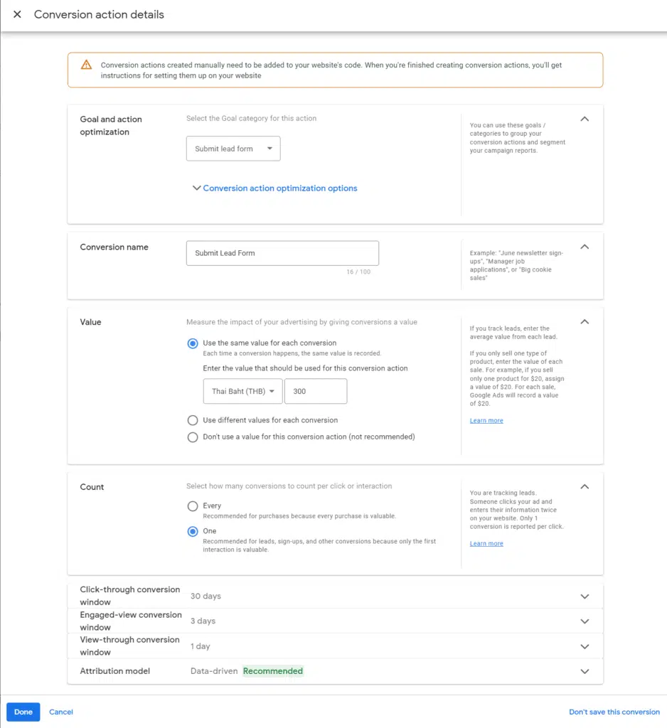 c) Enter in the value of this lead depending on how much it’s worth to you. For us, each lead is worth THB 300, but you can leave this empty if you don’t know.