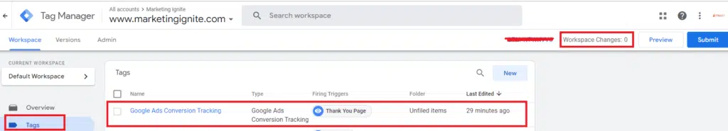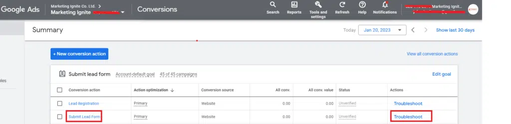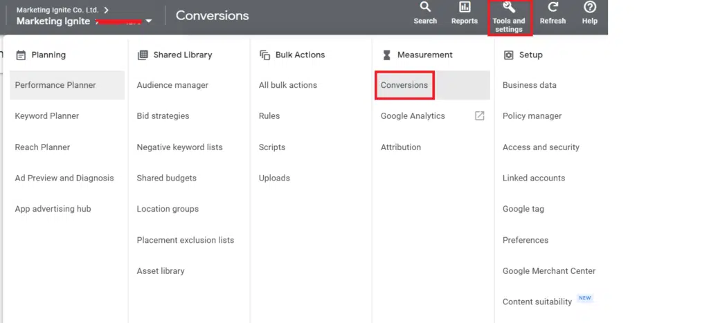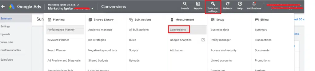 If the conversion tracking is not working properly, you need to check if the Google Ads “Conversion ID” and the “Conversion Label” in Google Ads are matching the same values as Google Tag Manager. To check if they are matching correctly, click on “tools and settings” in your Google Ad Account. Then click on “Conversions”.